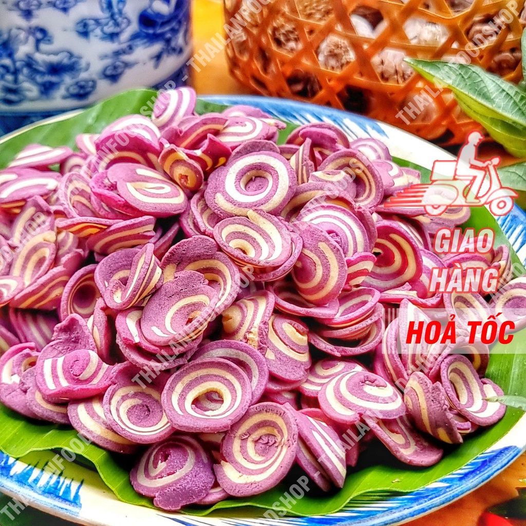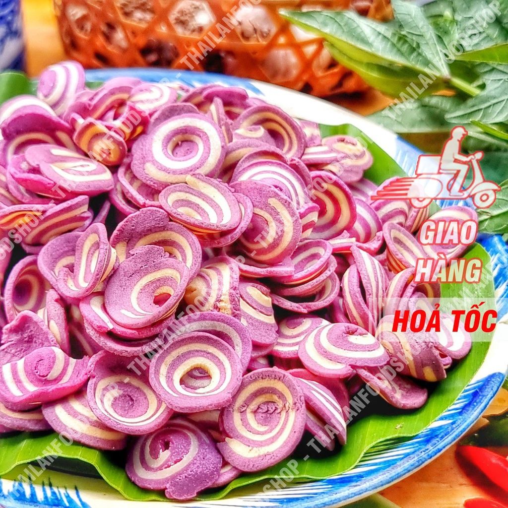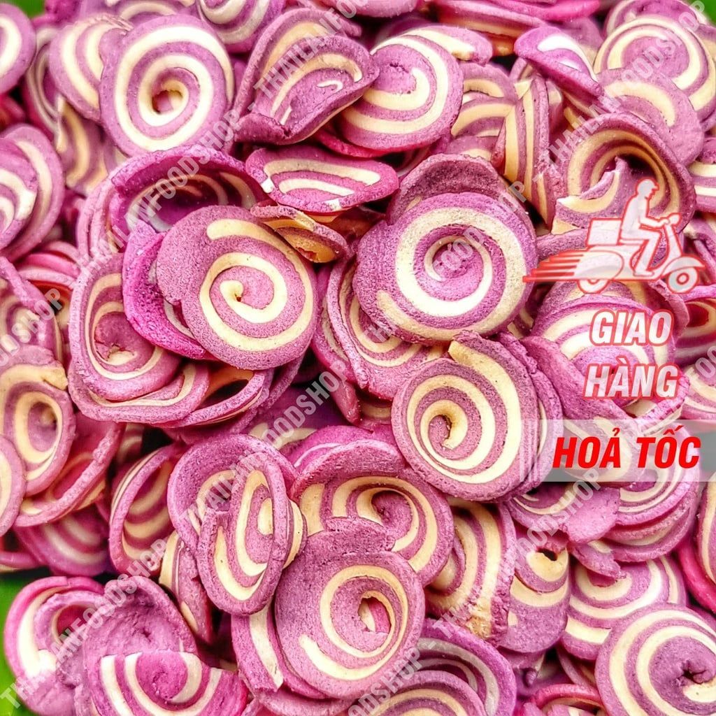 💟 Bánh có dạng lát mỏng, tròn hình thù giống tai của con heo có những đường sọc xoáy tròn đang xen giữa màu trắng sữa và màu tím nhạt của khoai môn - Nhìn cực kỳ cưng luôn. Ngồi buồn nhâm nhi em này là không gì bằng luôn ạ.