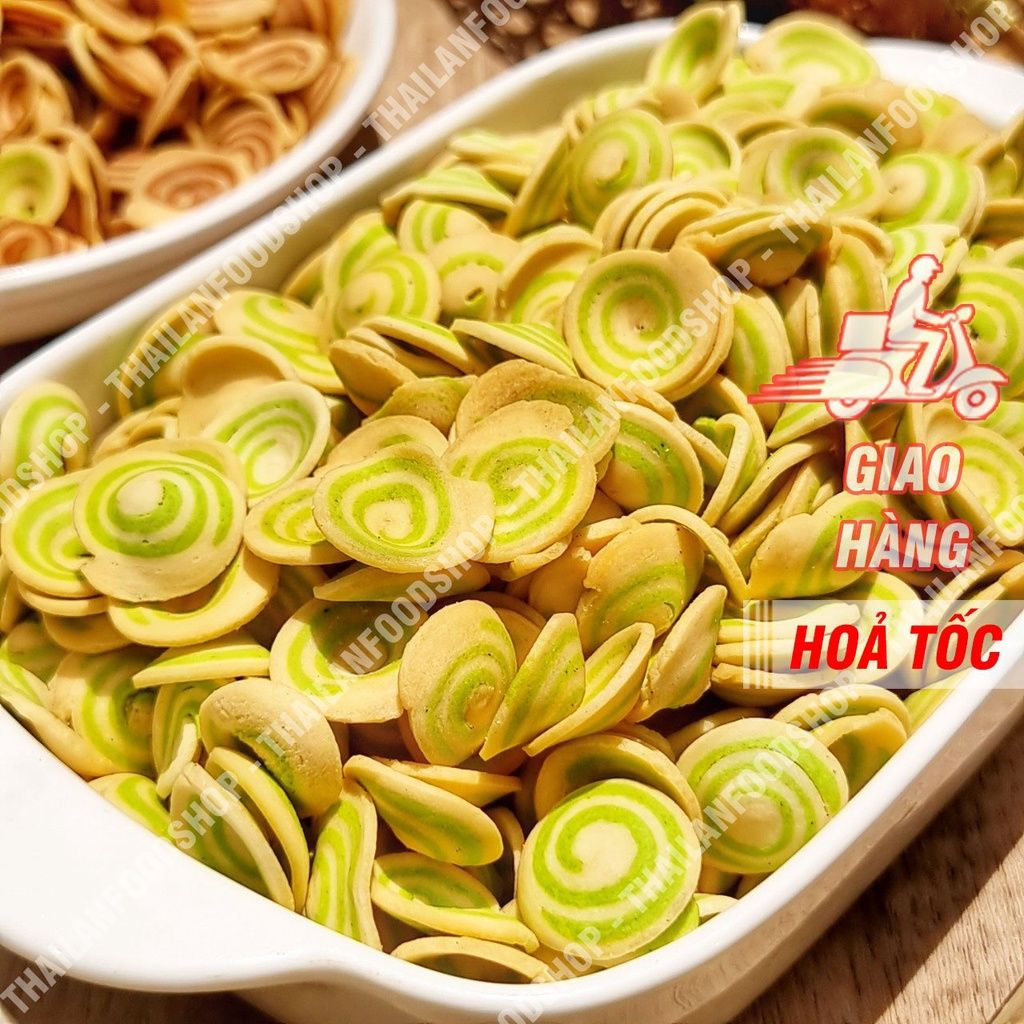 💟 Bánh có dạng lát mỏng, tròn hình thù giống tai của con heo có những đường sọc xoáy tròn đang xen giữa màu trắng sữa và màu xanh nhạt của trà - Nhìn cực kỳ cưng luôn. Ngồi buồn nhâm nhi em này là không gì bằng luôn ạ.