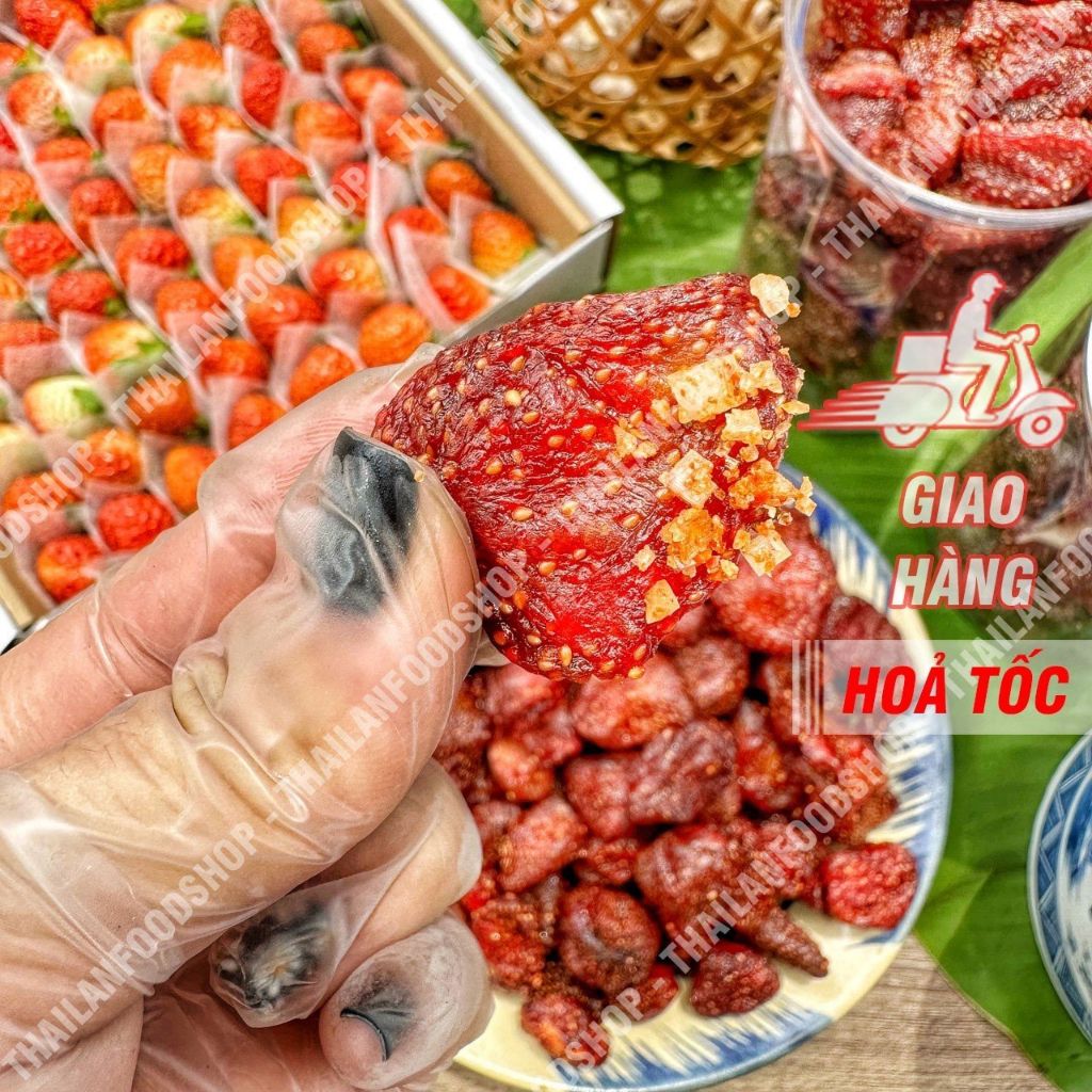 🍓🍓🍓 DÂU TÂY SẤY DẺO THÁI LAN - Dâu tây sấy dẻo nhưng vẫn giữ trọn được kích thước của từng quả dâu, nên so sánh với dâu sấy dẻo của Đà Lạt thì em Thái Lan quả sẽ to hơn nhiều lắm nha. Khi ăn thì thịt dâu giòn giòn, hương vị chua chua ngọt ngọt cực kỳ thơm ngon. Với công nghệ sấy hiện đại nên hầu như giữ được trọn vẹn màu đỏ hồng đẹp mắt cũng như hàm lượng chất dinh dưỡng của dâu tây nhe mấy tình yêu.
