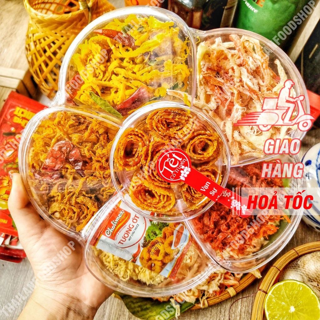 🌸🌺🏵️ HỘP KHÔ HOA MAI LỤC VỊ (Khô Bò/ Khô Mực Cán/ Khô Mực Sợi Hấp Dừa/ Khô Heo Tỏi/ Chà Bông Ruốc Heo/ Khô Gà) - Hộp Quà Tết Hình Bông Hoa xinh lắm luôn ạ. Nhà em mix 6 loại khô khác nhau, nhiều vị thơm ngon. Số 6 mang ý nghĩa là LỘC như lời chúc "PHÁT TÀI PHÁT LỘC" gửi đến những người thân quen trong dịp Tết này. ️🎏