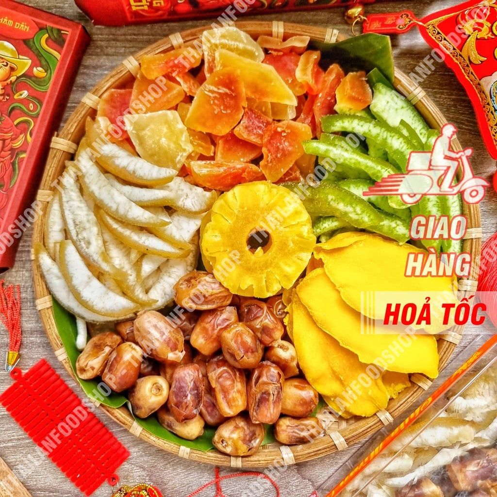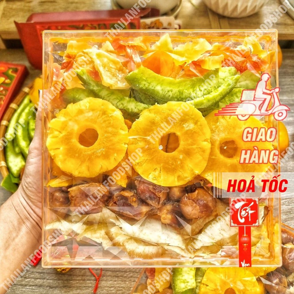🌸🌺🏵️ HỘP QUÀ TẾT KIM CƯƠNG MIX 6 LOẠI TRÁI CÂY SẤY DẺO (Thơm Sấy Dẻo Thái Lan/ Đu Đủ Sấy Chanh Dây/ Vỏ Bưởi Sấy Dẻo Thái Lan/ Vỏ Bưởi Non Sấy Đường Phèn/ Chà Là/ Xoài) - Hộp quà tết được đóng gói bằng hộp kim cương siêu sang mix 6 loại trái cây sấy dẻo đủ vị chua ngọt, nhiều vị thơm ngon. Số 6 mang ý nghĩa là LỘC như lời chúc "PHÁT TÀI PHÁT LỘC" gửi đến những người thân quen trong dịp Tết này. ️🎏