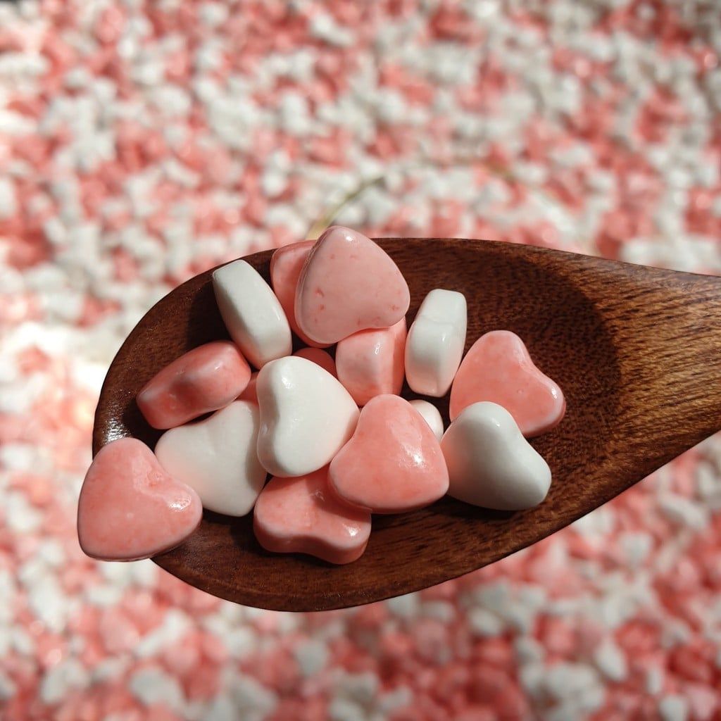 💟 Kẹo trái tim có vỏ ngoài cứng, khi cắn vỡ từng viên kẹo ra sẽ cảm nhận được vị chua ngọt thanh khiết của các tinh thể đường mát lạnh tan ra từ từ trong miệng.