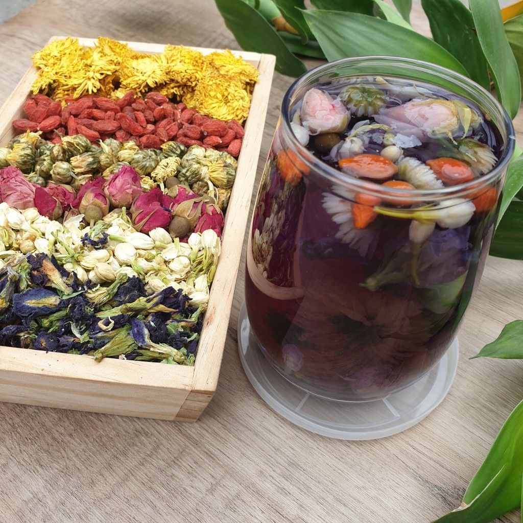 💟 Lục trà hoa là sự kết hợp của 6 loại trà: Kỷ tử , Nụ hoa hồng, Hoa cúc vàng, Nụ kim cúc, Nụ hoa nhài, Nụ đậu biếc.
