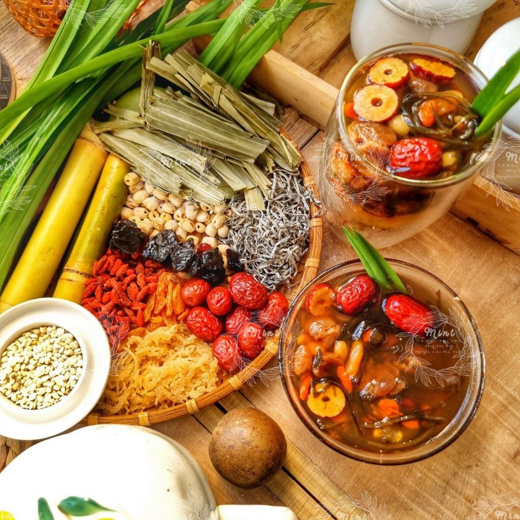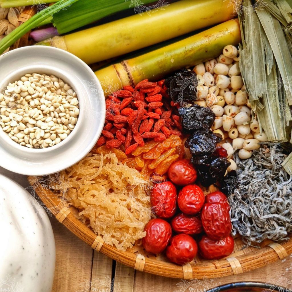 😍 Set bao gồm: Phổ Tai, Rong Sụn, Hạt Sen, Bo Bo, Kỷ Tử, Táo Lát, Táo Tân Cương, Nho Khô, Nhãn Nhục, Lá Dứa, Đường Phèn.
