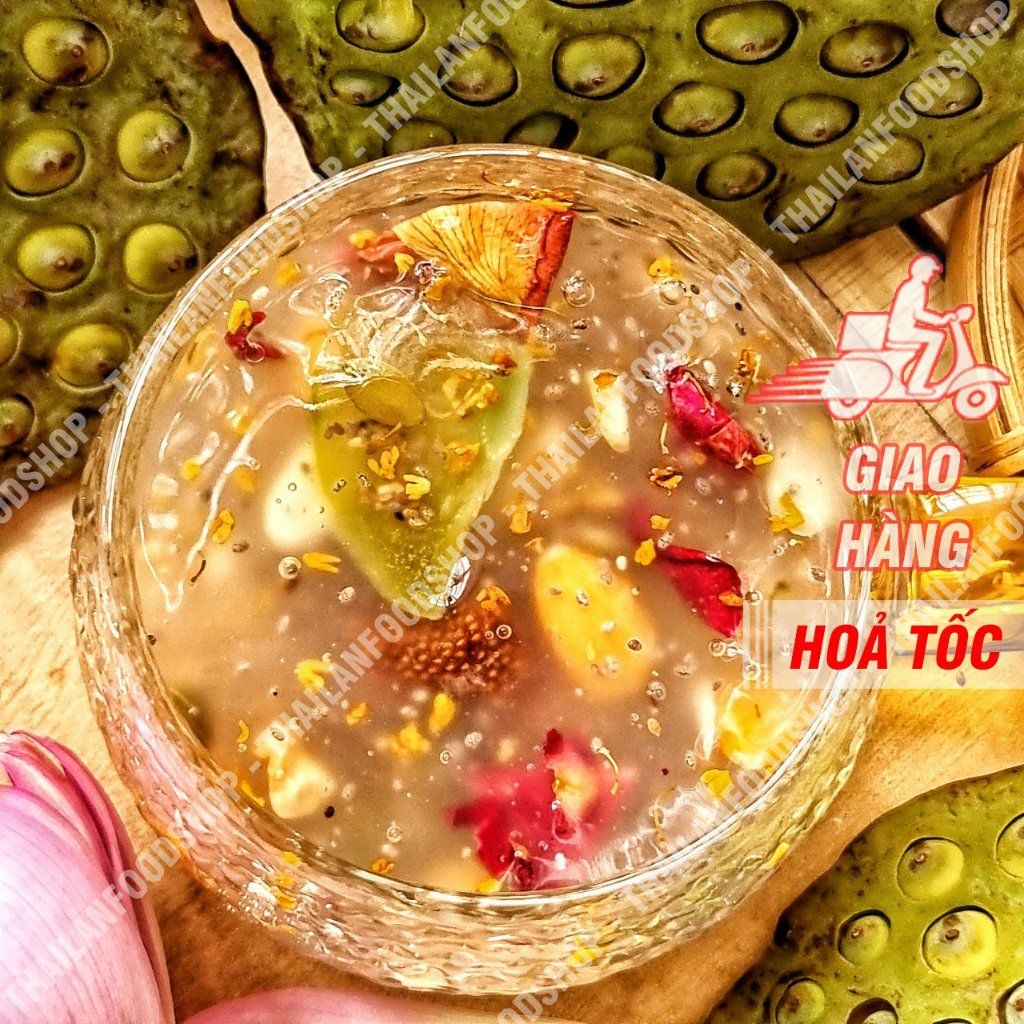 🍒 Thành phần: Bột Củ Sen, Đường Phèn, Hạt Hạnh Nhân, Hạnh Nhân Lát, Hạt Điều, Hạt Bí Xanh, Các Loại Trái Cây Sấy Dẻo (Nho khô, Dâu Tây, Kiwi, Thơm, Xoài, Ô Mai Chua Ngọt...), Quế Hoa, Cánh Hoa Hồng, Hạt Chia. 🍓